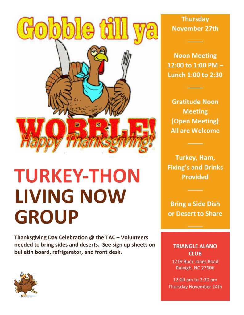 The Living Now is a AA group with 11 meetings a week meeting at the Triangle Alano Club in Raleigh. See link below for meeting schedule.